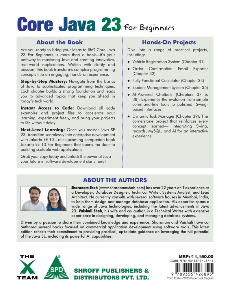 Are you ready to bring your ideas to life? Core Java 23 For Beginners is more than a book—it’s your pathway to mastering Java and creating innovative, real-world applications. Written with clarity and passion, this book transforms complex programming concepts into an engaging, hands-on experience.