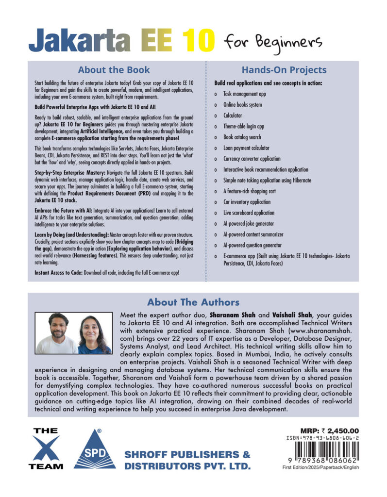 Ready to build robust, scalable, and intelligent enterprise applications from the ground up? Jakarta EE 10 for Beginners guides you through mastering enterprise Jakarta development, integrating Artificial Intelligence, and even takes you through building a complete E-commerce application starting from the requirements phase!